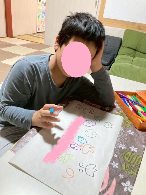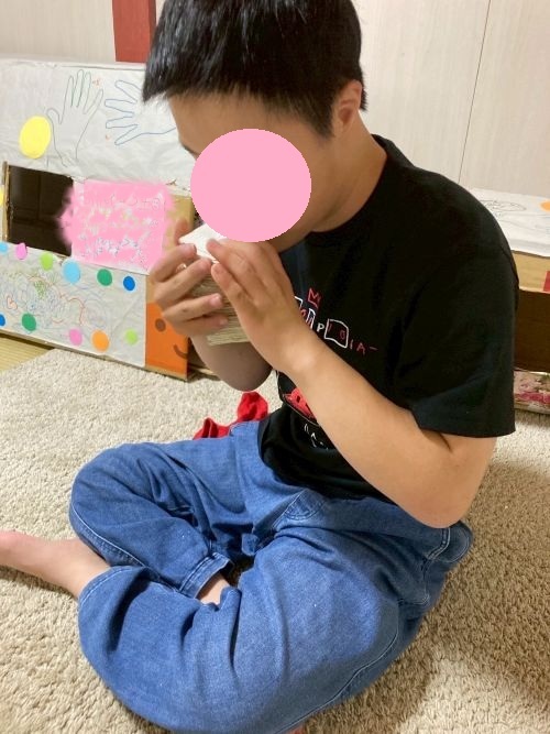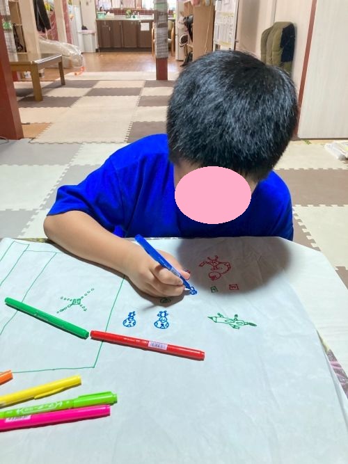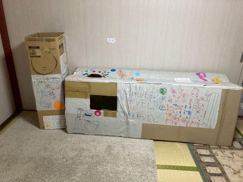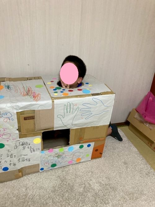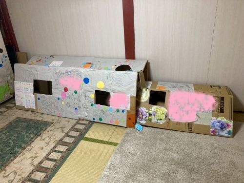 子ども達には紙にたくさん絵を描いてもらってトンネルに貼り付けました!