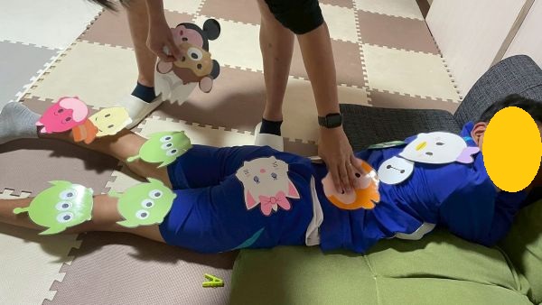 引っ越し作業で出てきたディズニーのキャラクターを背中や足にぺたぺた。